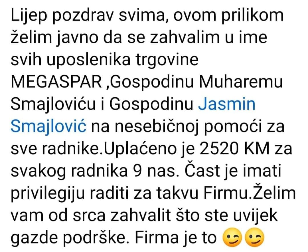 Bilježimo još jedan pozitivan i hvale vrijedna gest u lokalnoj privredi, a ovoga puta mjesto radnje je MEGASPAR iz Sanskog Mosta.