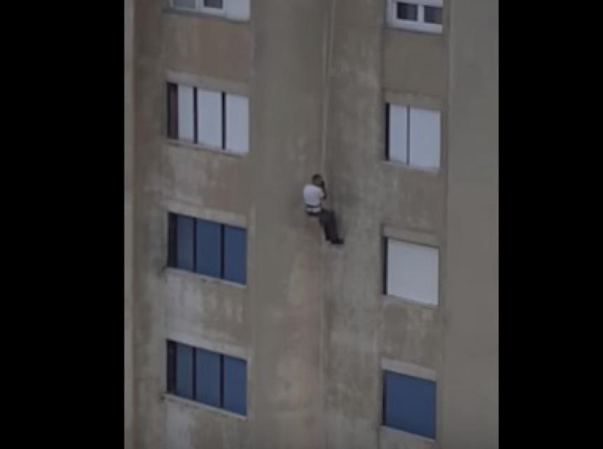 Zakačen za uže, mladić se s lakoćom spuštao niz zgradu, ostavljajući za sobom, kako prikazuju fotografije, sprejem ucrtana slova. "You was my first love' glasi njegova gramatički netačna poruka na engleskom, koja bi u prijevodu glasila "Bila si mi prva ljubav"