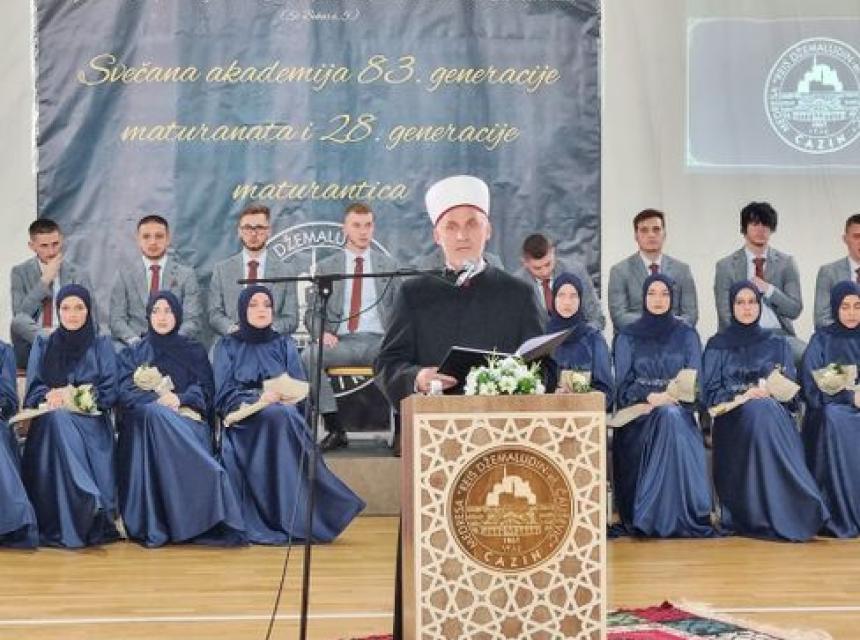 Medresa "Reis Džemaludin-ef. Čaušević" u Cazinu je ispratila svoju 83. generaciju svečanom akademijom koja je održana u subotu, 20.5.2023. godine u Cazinu. Pored 53 maturanta i maturantice, roditelja i nastavnog osoblja, prisustvovali su i izaslanik reisu-l-uleme hafiz dr. Mensur-ef. Malkić, rukovodilac Službe za vjerske poslove i obrazovanje Rijaseta Islamske zajednice u Bosni i Hercegovini, muftija bihaćki hafiz Mehmed-ef. Kudić, dekan Islamskog pedagoškog fakulteta u Bihaću prof. dr. Hajrudin Hodžić, premijer Unsko-sanskog kantona Mustafa Ružnić i gradonačelnici Bužima i Cazina Mersudin Nanić i Nermin Ogrešević. Dodijeljene su nagrade i najboljim učenicima, a za učenike generacije proglašeni su Nahla Bajrektarević iz Bihaća i Emre Murgić iz Velike Kladuše.