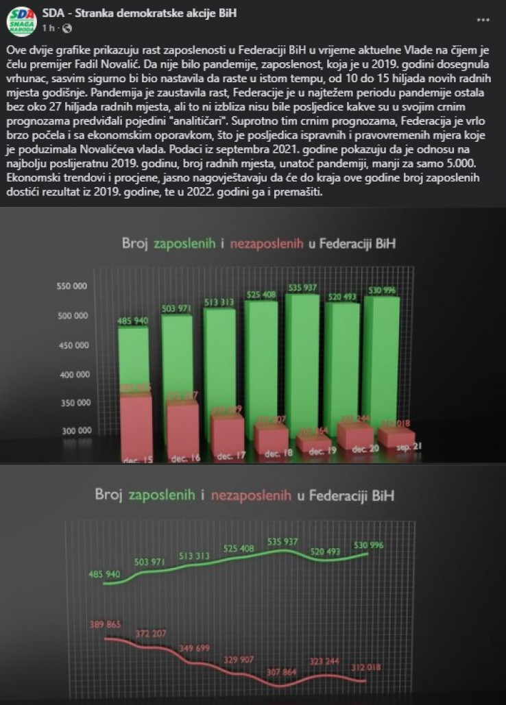 Neovisni eksperti hvataju se za glavu nakon što su na Facebook stranici SDA objavljeni grafikoni koji bi trebali ilustrirati rast zaposlenosti u FBiH u mandatu aktuelne Vlade na čelu sa Fadilom Novalićem. Da nije bilo pandemije koronavirusa koja je u 2019. godini dosegla vrhunac, navode iz SDA, broj zaposlenih rastao bi za 10.000 – 15.000 godišnje. Teško se sjetiti kada je u BiH otvorena veća fabrika, u vlastitom okruženju vidimo da se mladi iz BiH zaista zapošljavaju ali uglavnom u Njemačkoj, ali na čemu se zasniva ovakva SDA statistika za portal “Avaza” otkriva doktorica ekonomskih nauka, analitičarka Svetlana Cenić.