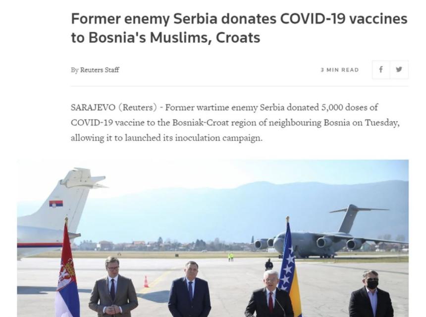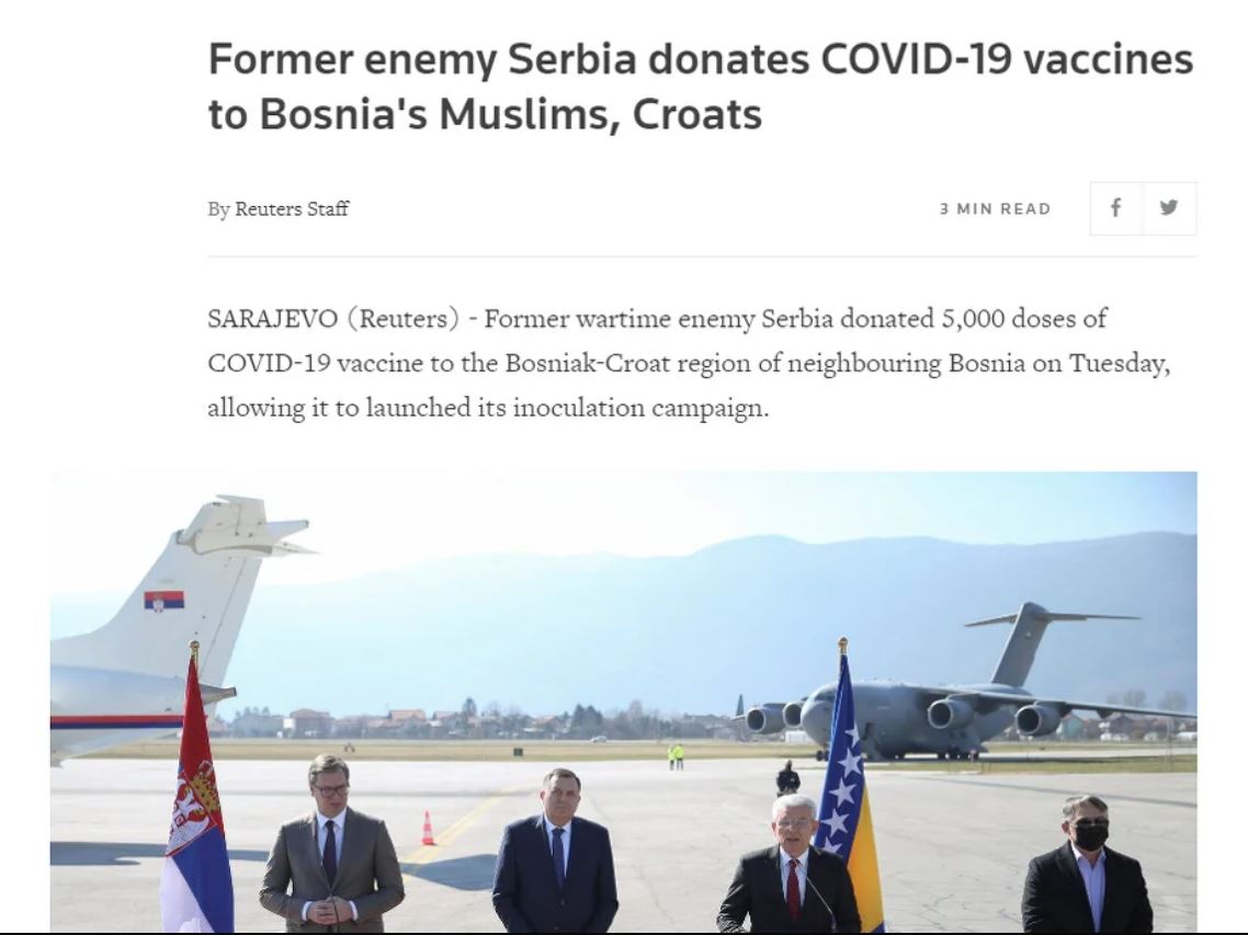 "Bivši ratni neprijatelj Srbija donirala je u utorak 5.000 doza vakcina Covid-19 susjednoj BiH, što joj je omogućilo pokretanje vakcinacije. Na sarajevskom aerodromu predsjednik Srbije Aleksandar Vučić uručio je vakcine članovima tročlanog Predsjedništva BiH Šefiku Džaferoviću, Željku Komšiću i Miloradu Dodiku”, piše Reuters.