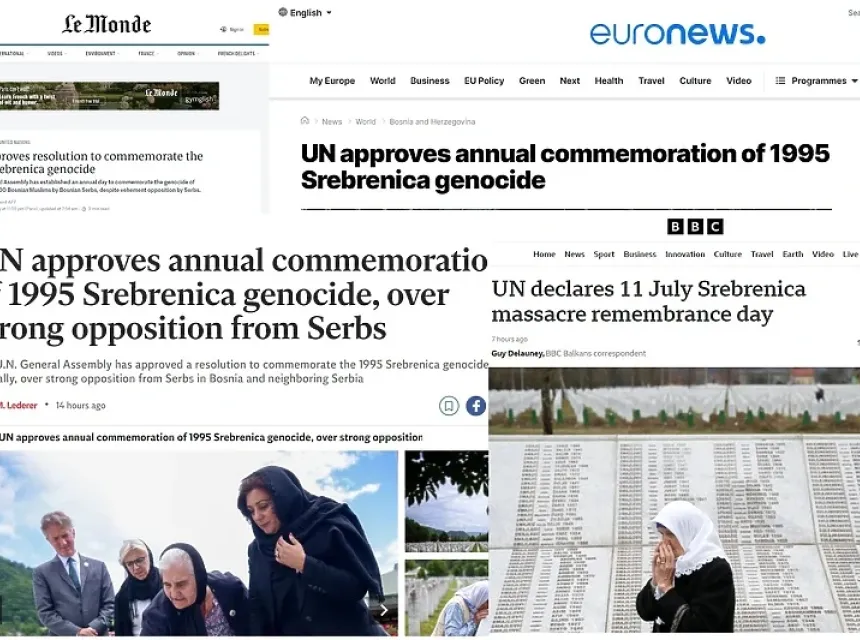 Brojni svjetski mediji izvijestili su da je Generalna skupština UN-a donijela odluku o uspostavljanju Međunarodnog dana sjećanja na genocid u Srebrenici te usvojila Rezoluciju uprkos žestokom lobiranju Srbije.