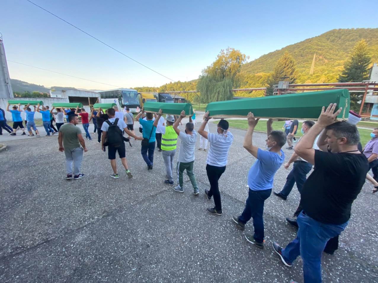 Iz kruga bivše Fabrike akumulatora u Potočarima u večernjim satima do prostora Musalle u Memorijalnom centru Srebrenica - Potočari izneseni su tabuti s posmrtnim ostacima devet identificiranih žrtava genocida u Srebrenici.