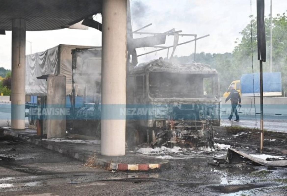 Tada je buknuo požar u kome su potpuno izgorjeli kamioni, a zahvatio je i dio benzinske pumpe.