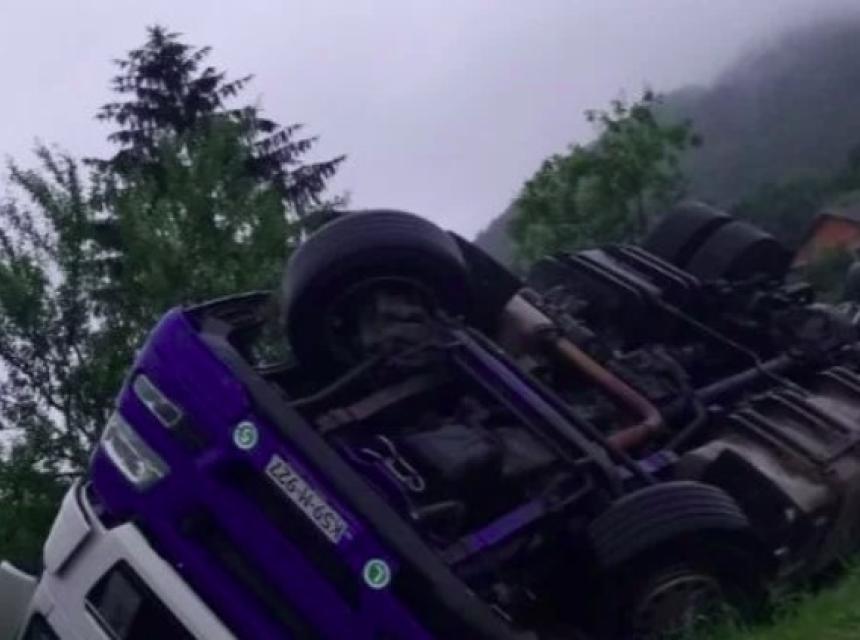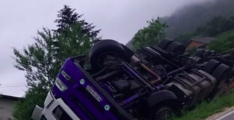 Veliki kamion natovaren daskama sletio je s puta na Manjači i završio prevrnut u kanalu.