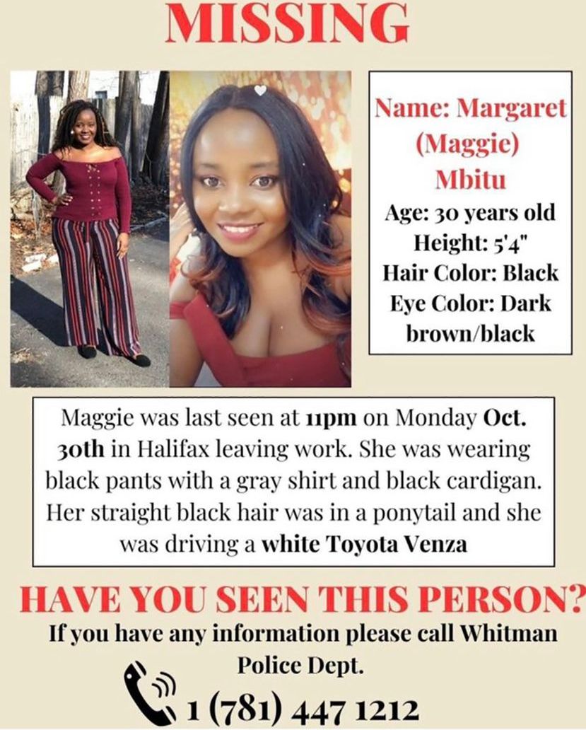 Margaret Mbitu (31) pronađena je izbodena na smrt na sjedištu svog automobila na aerodromu Logan u Bostonu. Tijelo ubijene žene je pronađeno 31. oktobra na suvozačevom sjedištu na aerodromu, a za njeno zvjersko ubistvo se sumnjiči momak Kevin Kangete (Kangethe), koji je nakon zločina pobjegao u Keniju.