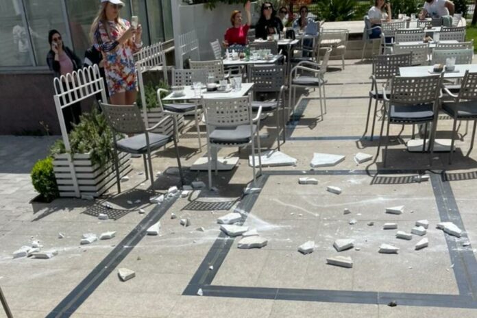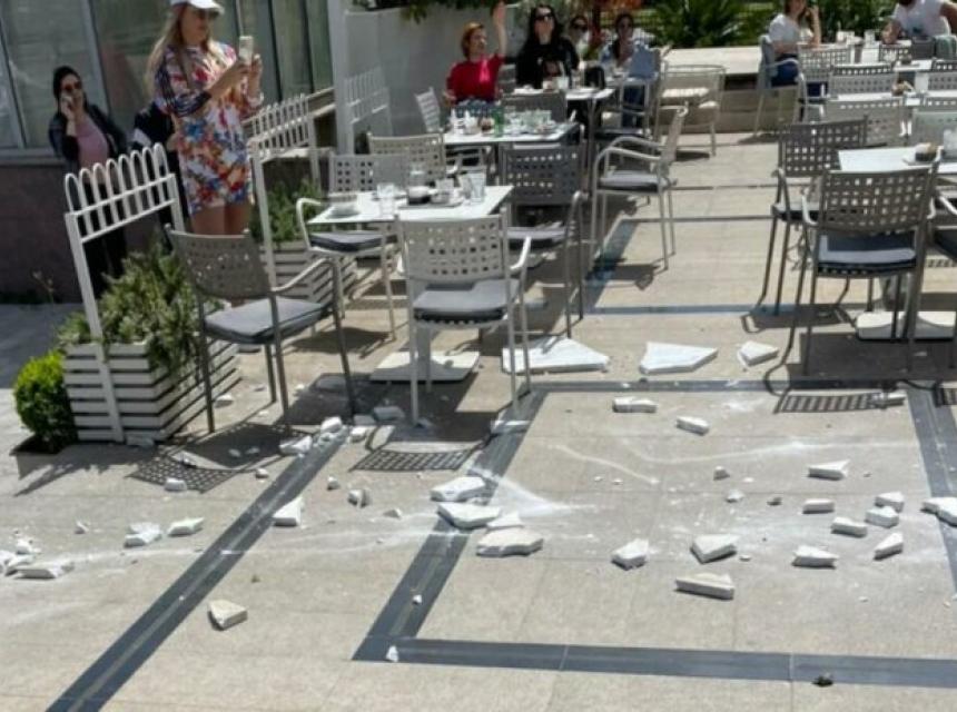 Danas se pojavio snimak koji pokazuje da je malo nedostajalo da se dogodi tragedija. Osim što su ploče sa zgrade pale nedaleko od ljudi koji su tu sjedili, na snimku se vide dvije djevojčice koje su tuda prolazile.