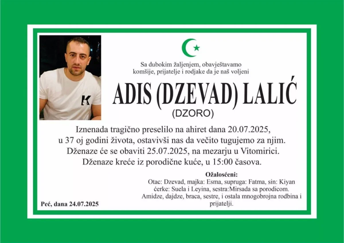 Dženaza Adisu Laliću bit će obavljena 25. jula 2025. godine na mezarju u Vitomirici, s polaskom ispred porodične kuće u 15:00 sati. Porodica, prijatelji i komšije oprostit će se od čovjeka kojeg su, kako kažu, pamtili svi naraštaji.