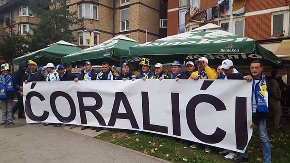 Transparenti sa imenima raznih gradova iz BiH i svijeta, a među njima i Ćoralići iz Cazina.
