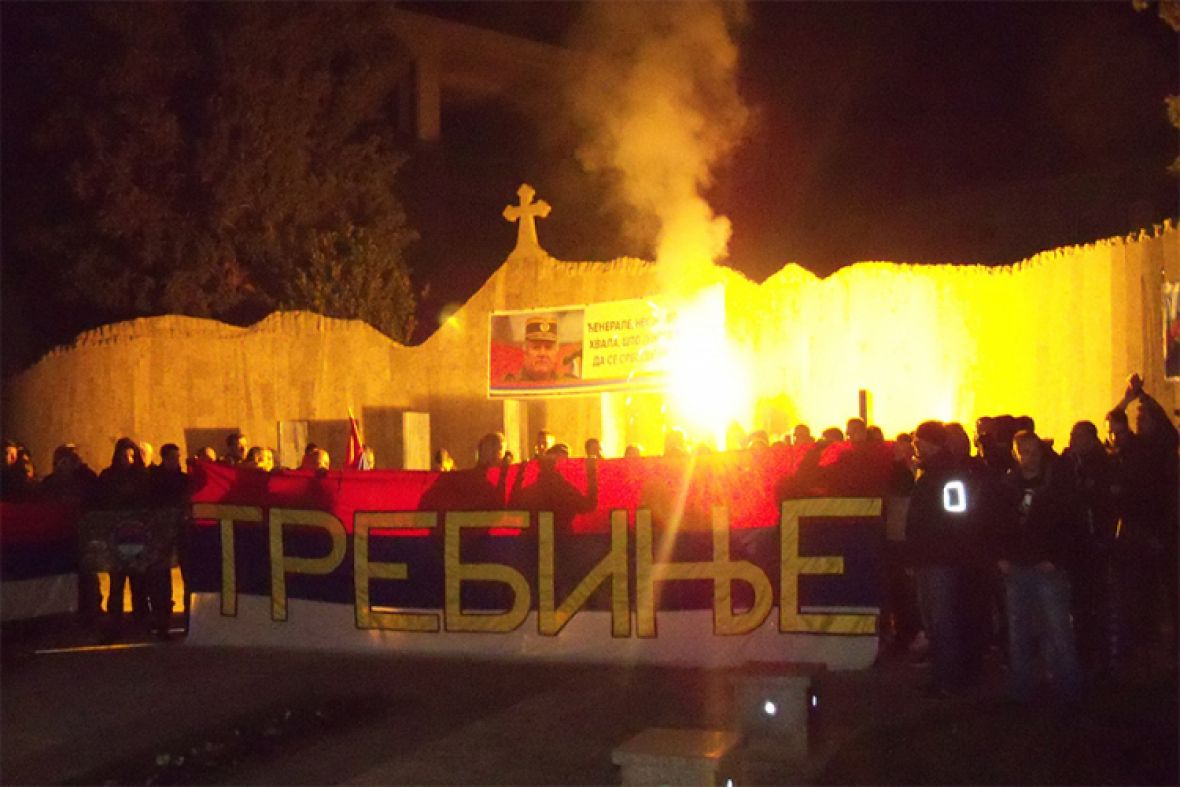 Stotinjak građana Trebinja, mahom mladih navijača Crvene zvezde i Partizana, te pripadnika Udruženja potomaka palih boraca proteklog rata „Nasljeđe“, okupilo se večeras kod Spomenika braniocima Trebinja 1991 – 1995. u znak protesta protiv doživotne zatvorske kazne kojom je Haški tribunal osudio danas bivšeg komadanta VRS-a Ratka Mladića.