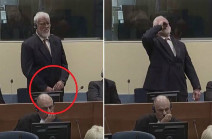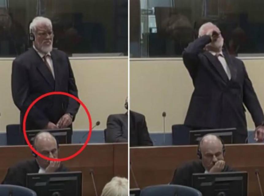 Nakon što mu je sudija pročitao zatvorsku kaznu, Praljak upućuje brz pogled prema čuvaru s desne strane, a potom dolje u svoje ruke u kojoj je bočica. Tada kamera pokazuje da Praljak u desnoj ruci drži bočicu, a lijevom je pridržava za čep. Potom ispija sadržaj desnom rukom dok u lijevoj drži čep. I nakon toga, prema viđenom, reakcija osiguranja je mlaka. Skoro je minuta prošla dok je sudija reagirao. No, čini se da sve to njega nije zabrinulo. U nastavku čitanja presuda, tri sata kasnije, u sudnici su kraj optuženih i nadalje samo dva čuvara. Nisu poduzete nikakve dodatne mjere.