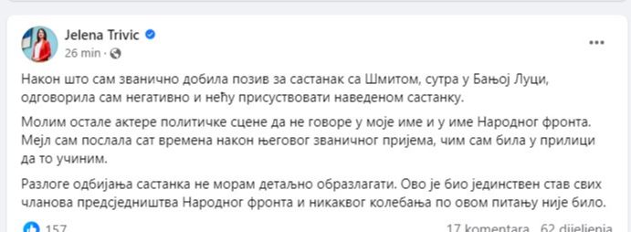 - Nakon što sam zvanično dobila poziv za sastanak sa Šmitom, sutra u Banjoj Luci, odgovorila sam negativno i neću prisustvovati navedenom sastanku. Molim ostale aktere političke scene da ne govore u moje ime i u ime Narodnog fronta. Mail sam poslala sat vremena nakon njegovog zvaničnog prijema, čim sam bila u prilici da to učinim.