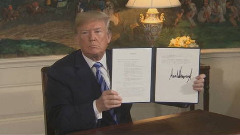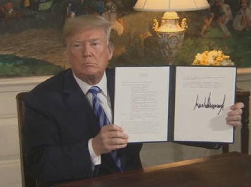 Trump je u saopćenju naveo da je međunarodni sporazum o obustavljanju iranskog nuklearnog programa u zamjenu za ukidanje sankcija "strašan, jednostrani dogovor" kojim je iranska vlada zaradila novac koji koristi za raspirivanje konflikta na Bliskom istoku.