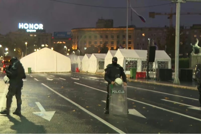 Na snimci se vidi kako policajci trče prema šatorima postavljenima ispred Skupštine kako bi spriječili daljnju eskalaciju sukoba i smirili situaciju među okupljenima.
