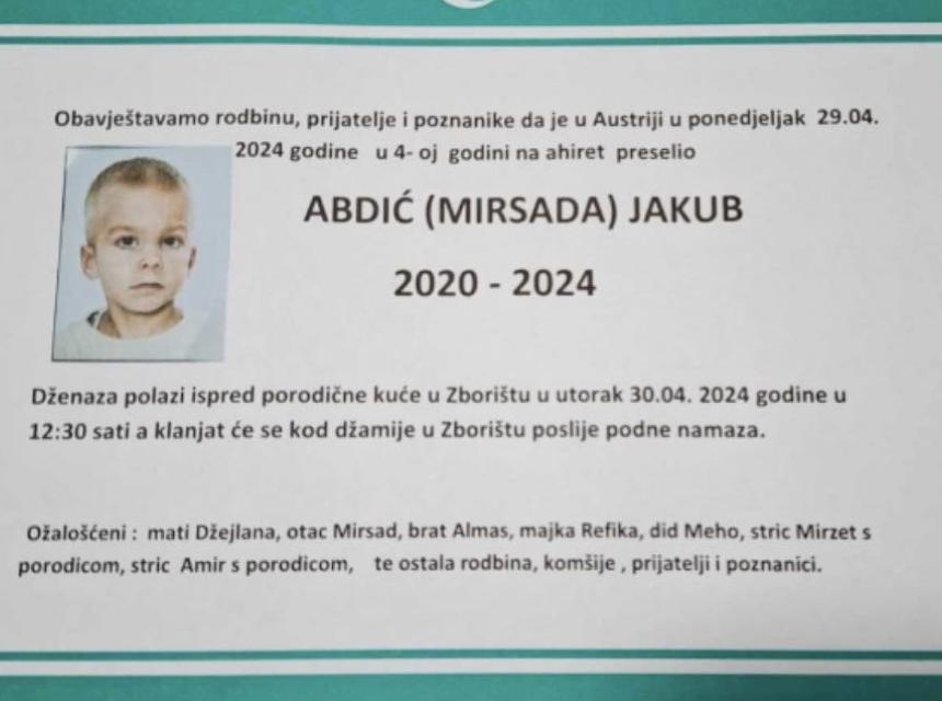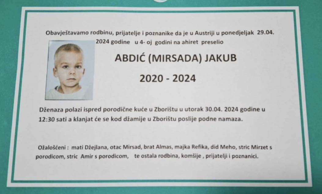 Sa žalošću javljamo rodbini, prijateljima i komšijama da je naš dragi Abdić Jakub dana 29.04.2024. godine preselio na Ahiret u 4-oj godini života.