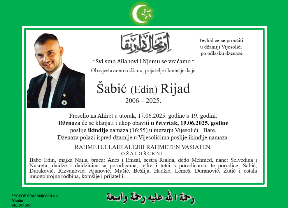 Iznenadna smrt Rijada Šabića iz Breze potresla je cijelu BiH. On je na ahiret preselio u utorak, u 19 godini života.