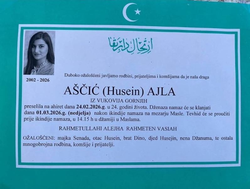 Duboko ožalošćeni javljamo rodbini, prijateljima i komšijama da je naša draga AŠČIĆ (Husein) AJLA preselila na ahiret dana 24.02.2026.g. u 24. godini života.