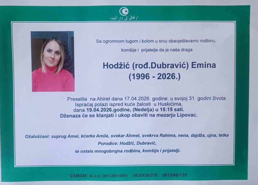 Dženaza-namaz i posljednji ispraćaj Emine Hodžić obavit će se u nedjelju, 19. aprila 2026. godine. Ispraćaj polazi ispred kuće žalosti u Huskićima u 15:15 sati, dok će se ukop obaviti na mezarju Lipovac.