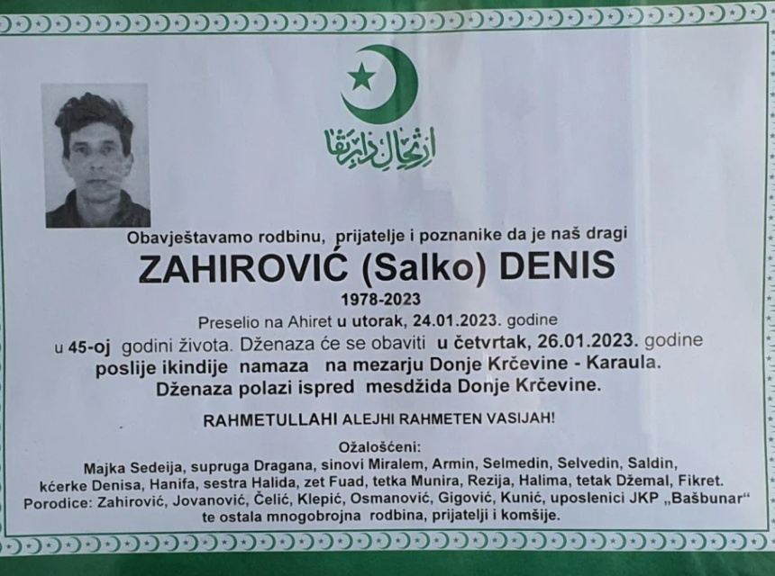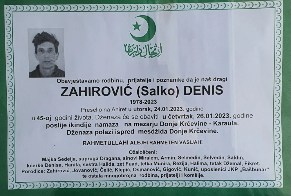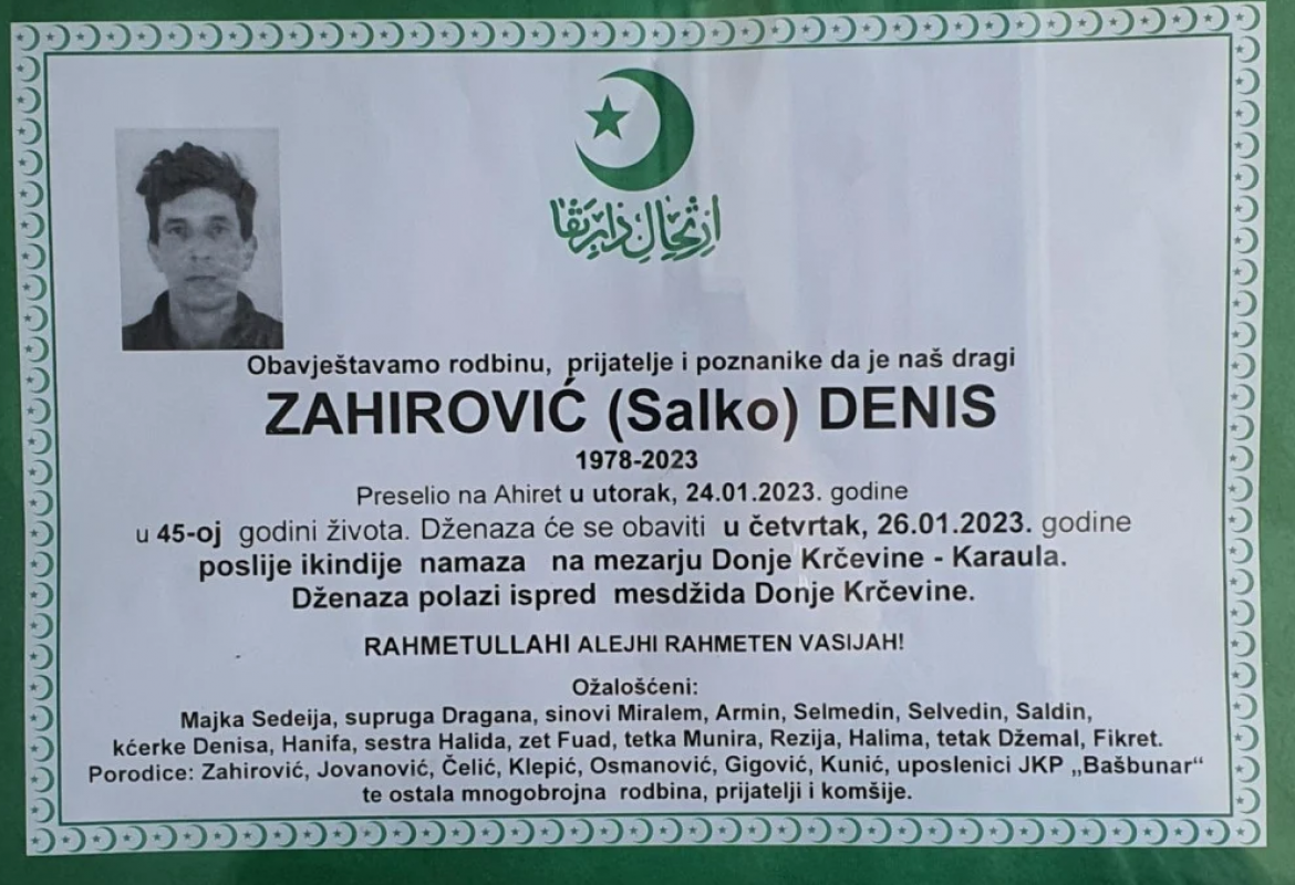 “Sa žalošću javljamo rodbini, prijateljima, poznanicima, radnim kolegama i poslovnim partnerima, da je naš dragi kolega Denis Zahirović tragično preselio na ahiret dana 24.01.2023. u svojoj 45-oj godini života.