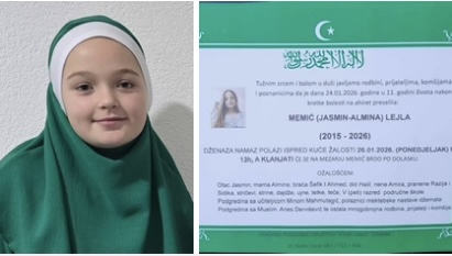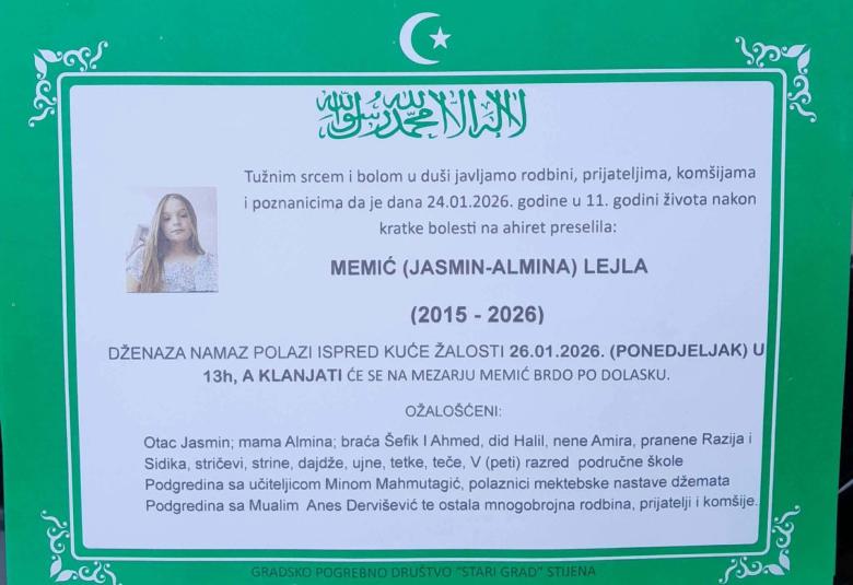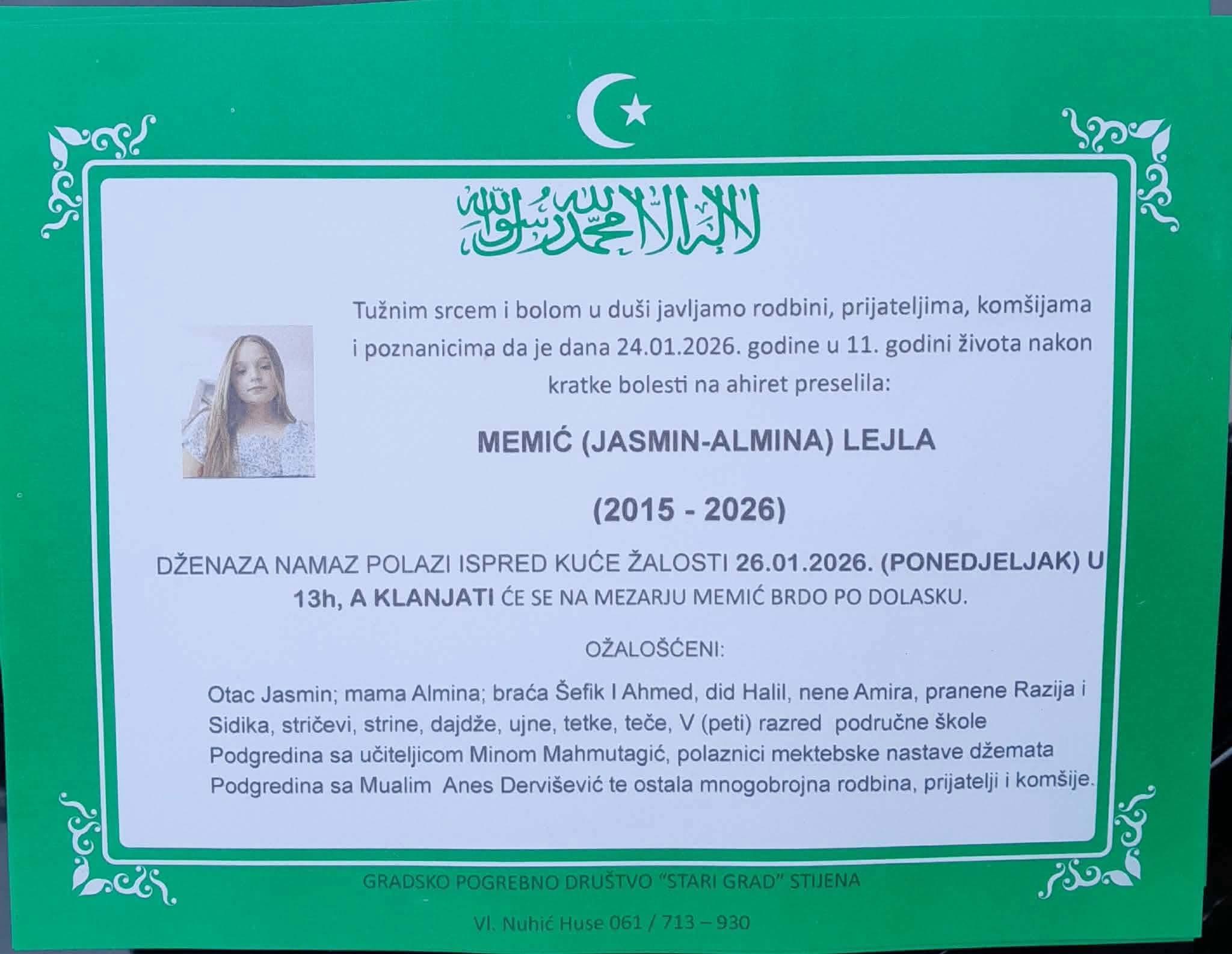 Dženaza-namaz klanjat će se u ponedjeljak, 26. januara 2026. godine, u 13 sati ispred kuće žalosti, dok će ukop biti obavljen na mezarju Memić Brdo po dolasku. Iza Lejle su u velikoj boli ostali otac Jasmin, majka Almina, braća Šefik i Ahmed, te brojna rodbina, prijatelji, školski drugari i komšije.