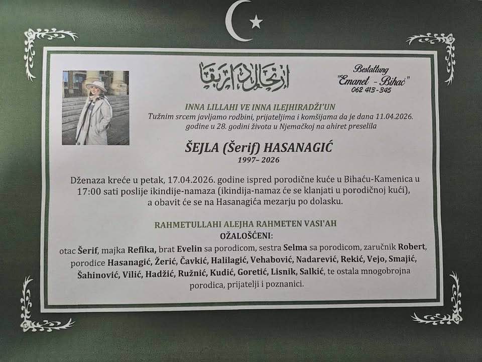 Dženaza kreće u petak, 17.04.2026. godine ispred porodične kuće u Bihaću-Kamenica u 17:00 sati poslije ikindije-namaza (ikindija-namaz će se klanjati u porodičnoj kući), a obavit će se na Hasanagića mezarju po dolasku.