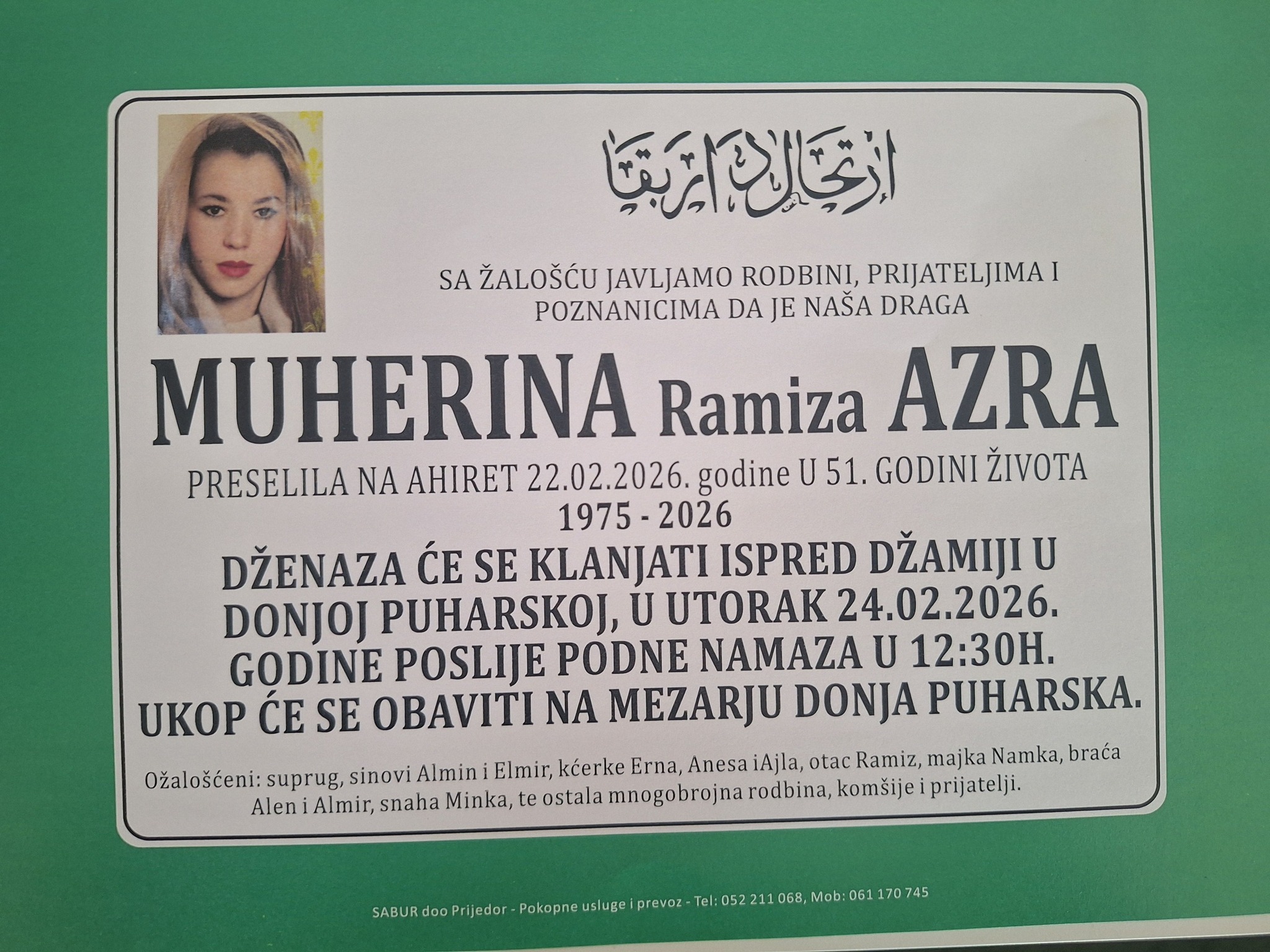 SA ŽALOŠĆU JAVLJAMO RODBINI, PRIJATELJIMA I POZNANICIMA DA JE NAŠA DRAGA MUHERINA Ramiza AZRA PRESELILA NA AHIRET 22.02.2026. godine U 51. GODINI ŽIVOTA.