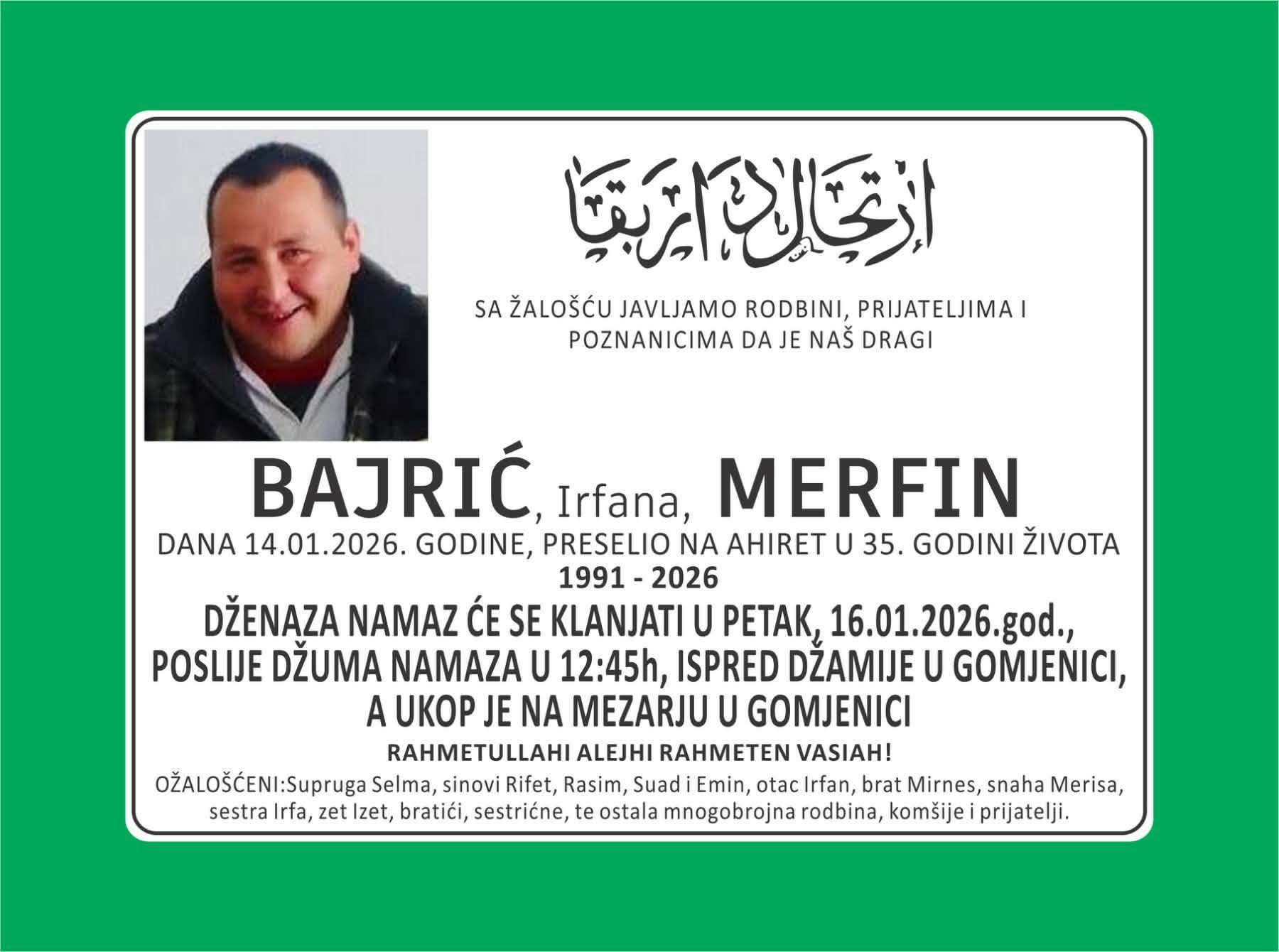 SA ŽALOŠĆU JAVLJAMO RODBINI, PRIJATELJIMA | POZNANICIMA DA JE NAŠ DRAGI BAJRIĆ (Irfana) MERFIN DANA 14.01.2026. GODINE, PRESELIO NA AHIRET U 35. GODINI ŽIVOTA.