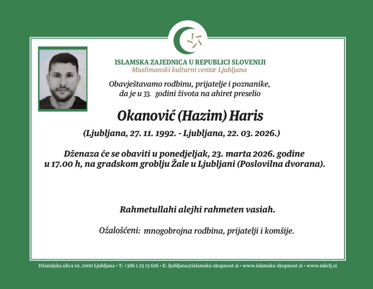 Dženaza će se obaviti u ponedjeljak, 23. marta 2026. godine u 17.00 h, na gradskom groblju Žale u Ljubljani (Poslovilna dvorana).