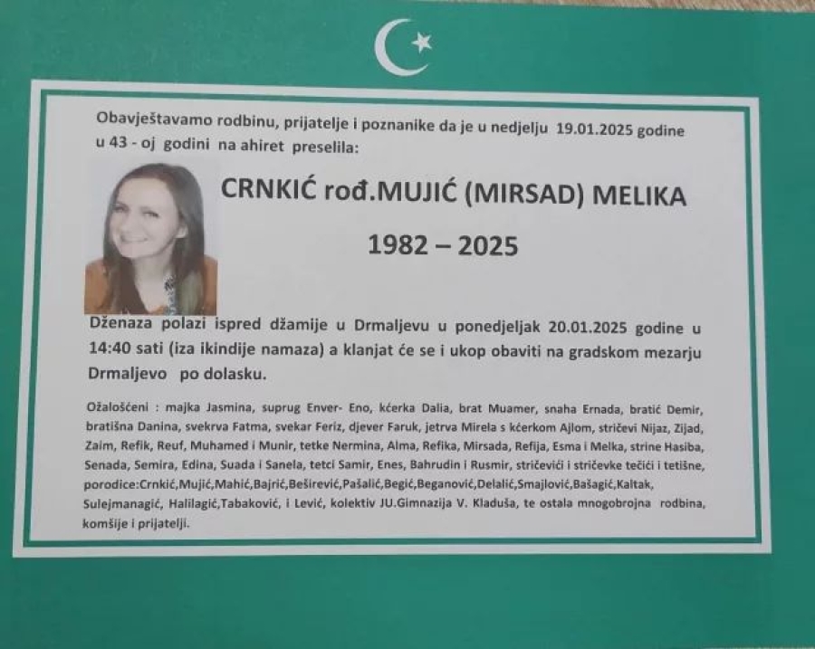 Nakon teške bolesti, u 43. godini života, na ahiret je preselila Melika Crnkić, profesorica njemačkog jezika iz Velike Kladuše.