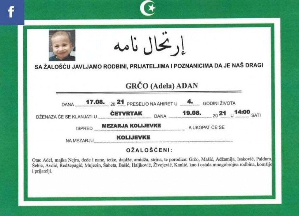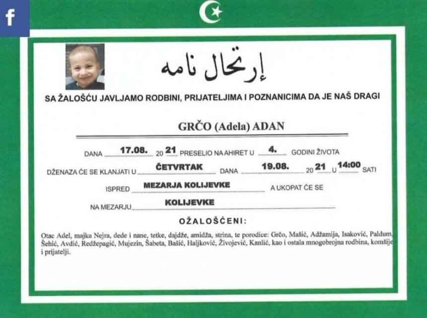 Dženaza malom Adanu klanjat će se danas u 14 sati, a ukop će biti obavljen na Gradskom mezarju Kolijevke.