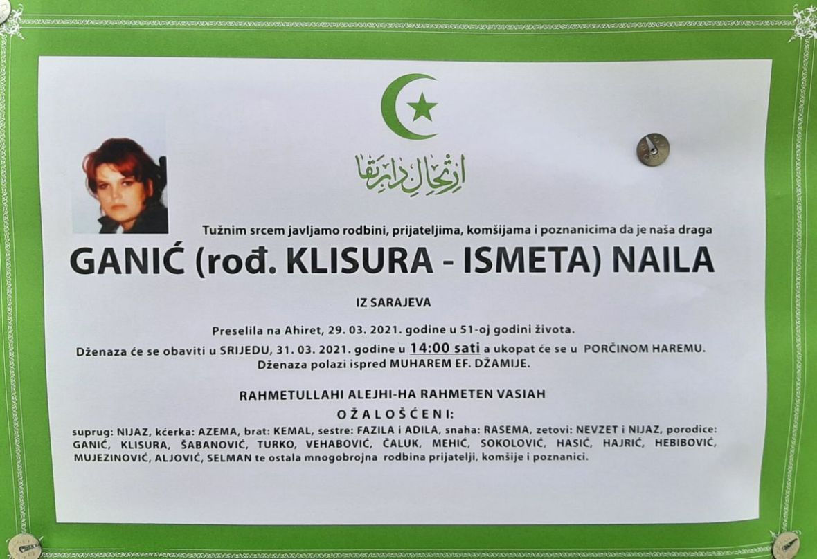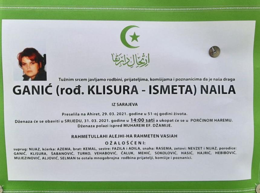Na bolji svijet je preselila Naila Ganić, rođena Klisura, iz Fojnice-Sarajeva u 51. godini života