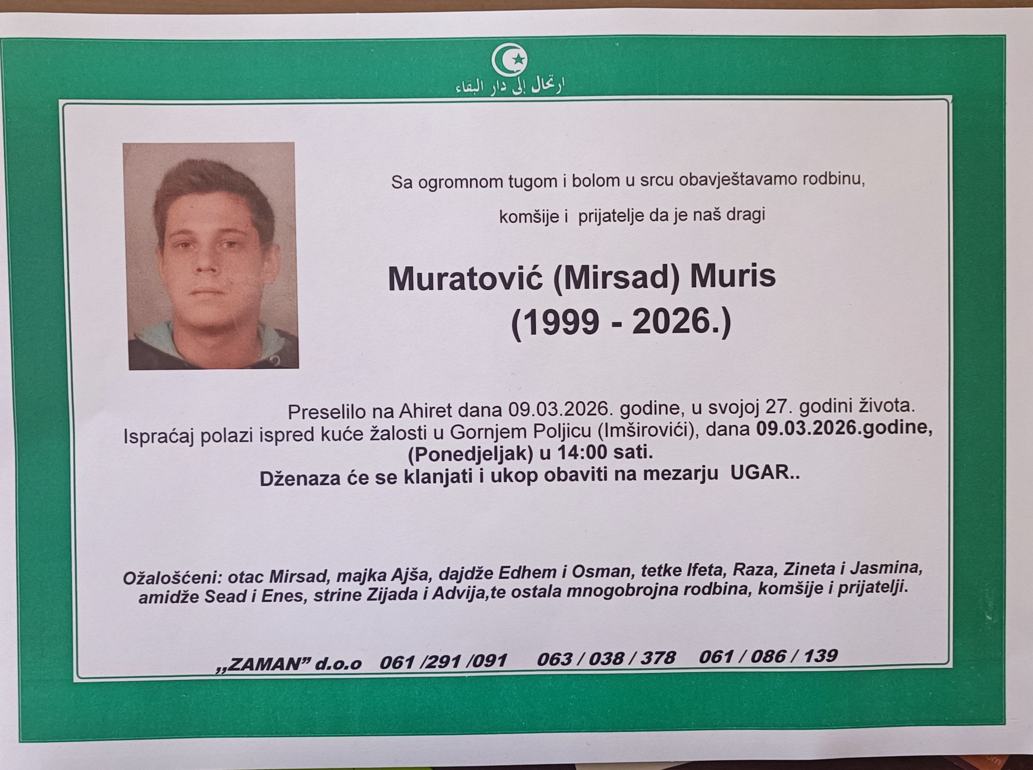 Sa ogromnom tugom i bolom u srcu obavještavamo rodbinu, komšije i prijatelje da je naš dragi Muratović (Mirsad) Muris preselilo na Ahiret dana 09.03.2026. godine, u svojoj 27. godini života.