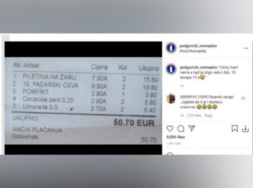 "Ulcinj. Nema meni, al kada mi je stigao račun - šok! Deset ćevapa, deset eura", poručio je u opisu fotke.