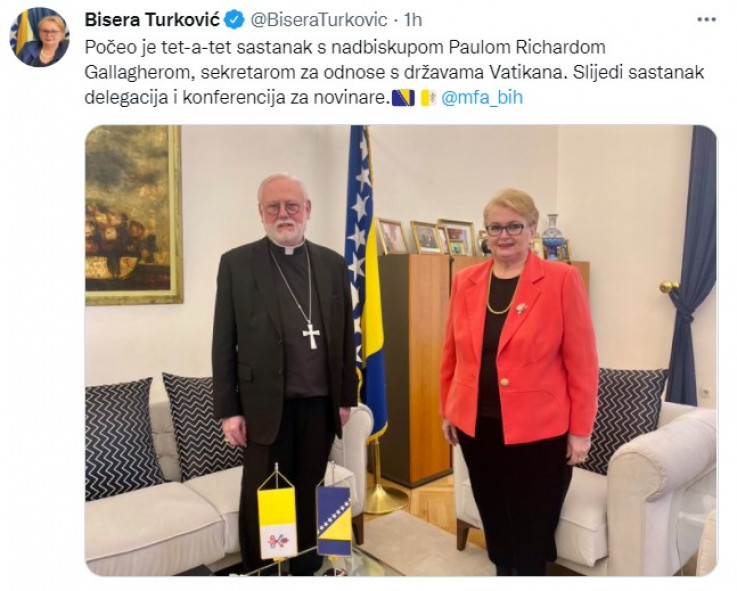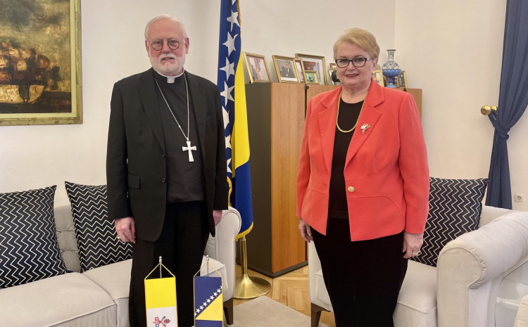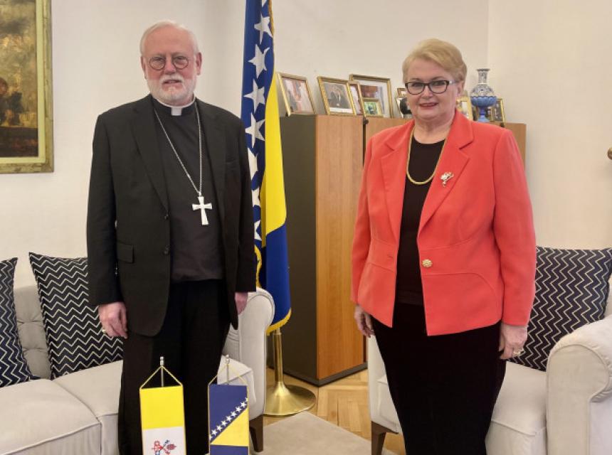 Zamjenica predsjedavajućeg Vijeća ministara i ministrica vanjskih poslova Bosne i Hercegovine Bisera Turković sastala se u Sarajevu s sekretarom za odnose s državama pri Državnom sekreterijatu Svete Stolice nadbiskupom Polom Ričardom Galagerom (Paul Richard Gallagher).