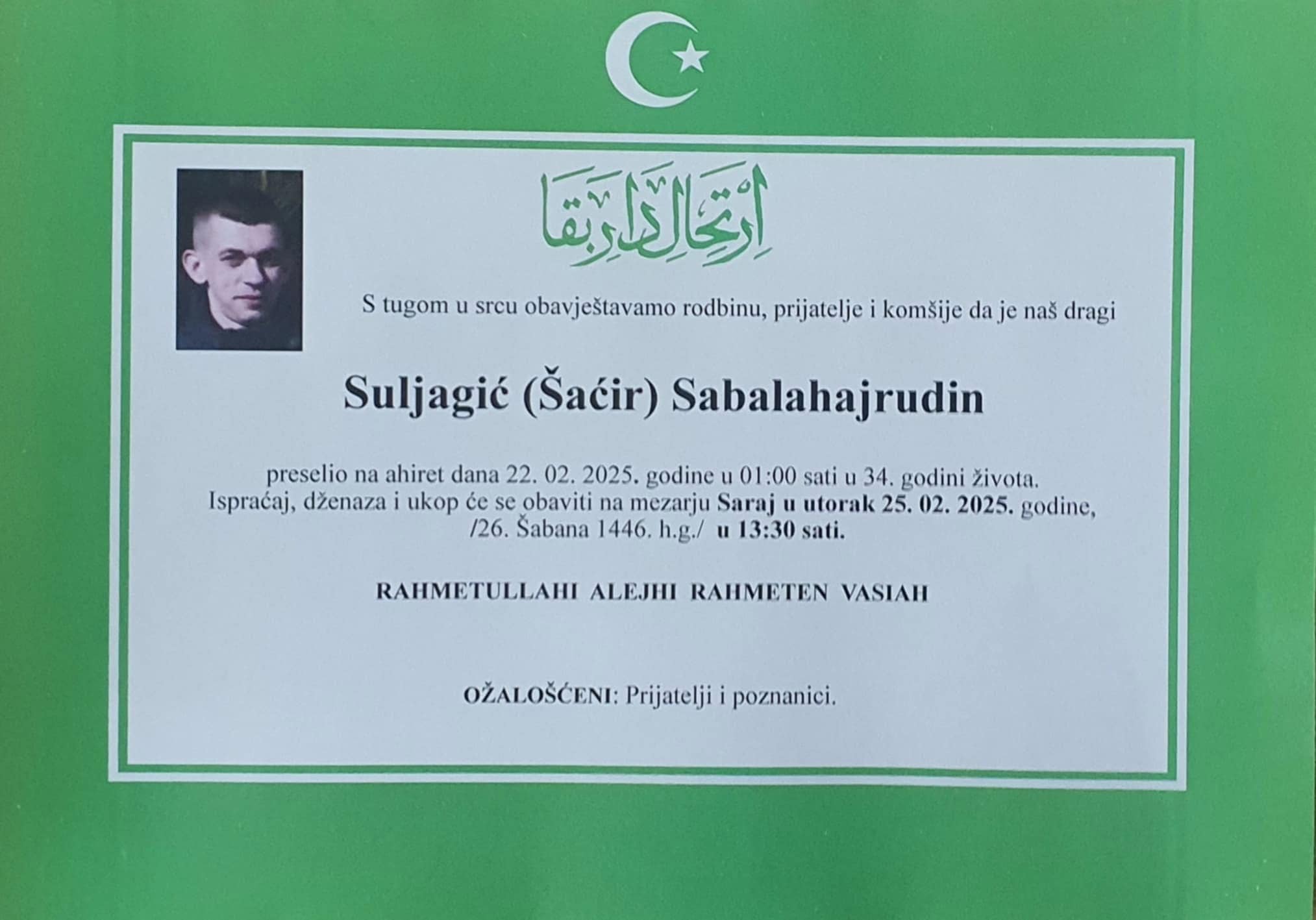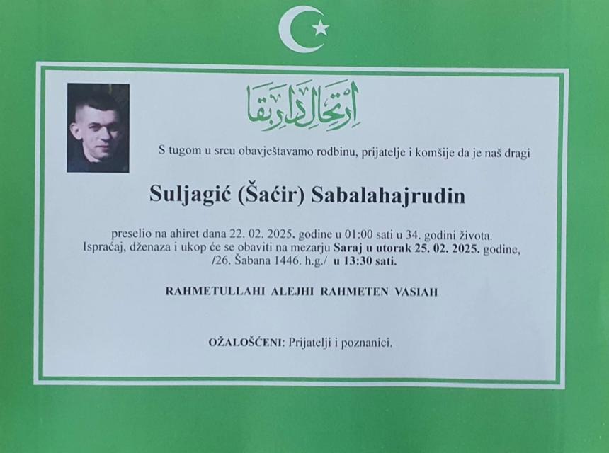 Ono što se vidi na posmrtnici jeste da Suljagić nema članova porodice.