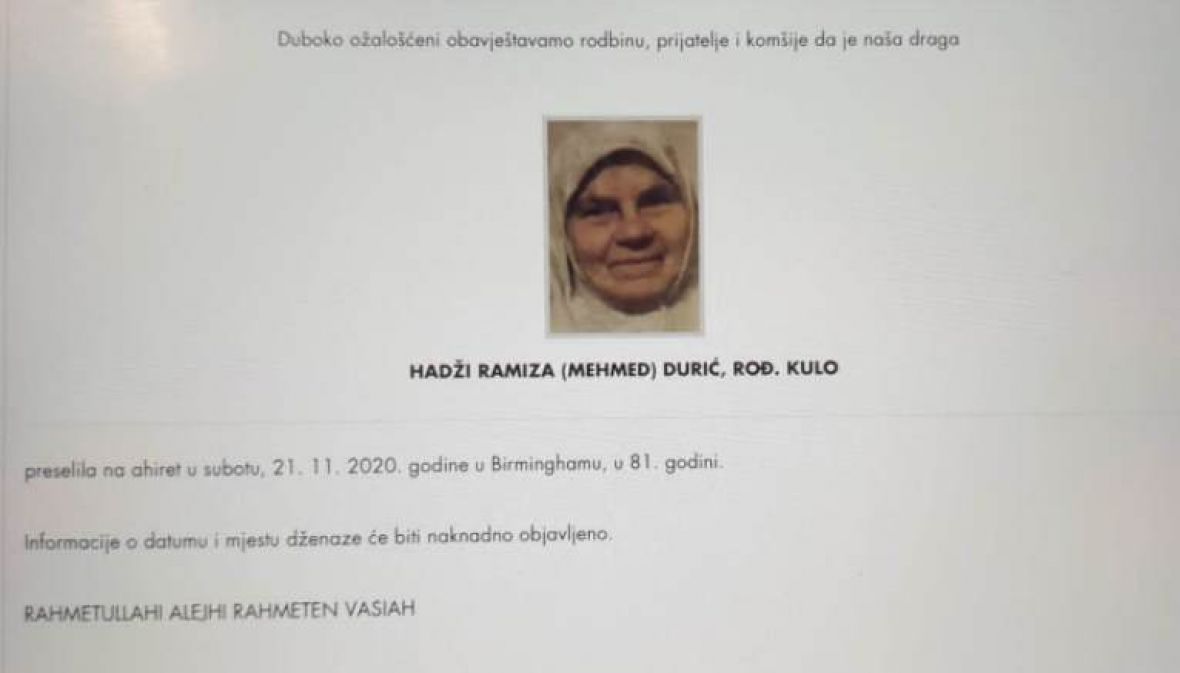 Svoj smiraj hadžinica Ramiza Durić naći će u Sarajevu pored svojih najmilijih. Datum dženaze, simbola bošnjačke majke, bola i tuge, bit će naknadno objavljen.