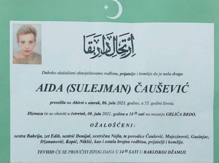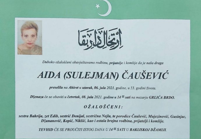 Dženaza će se obaviti srijedu, 8. jula, u 14 sati na mezarju Grlića brdo.