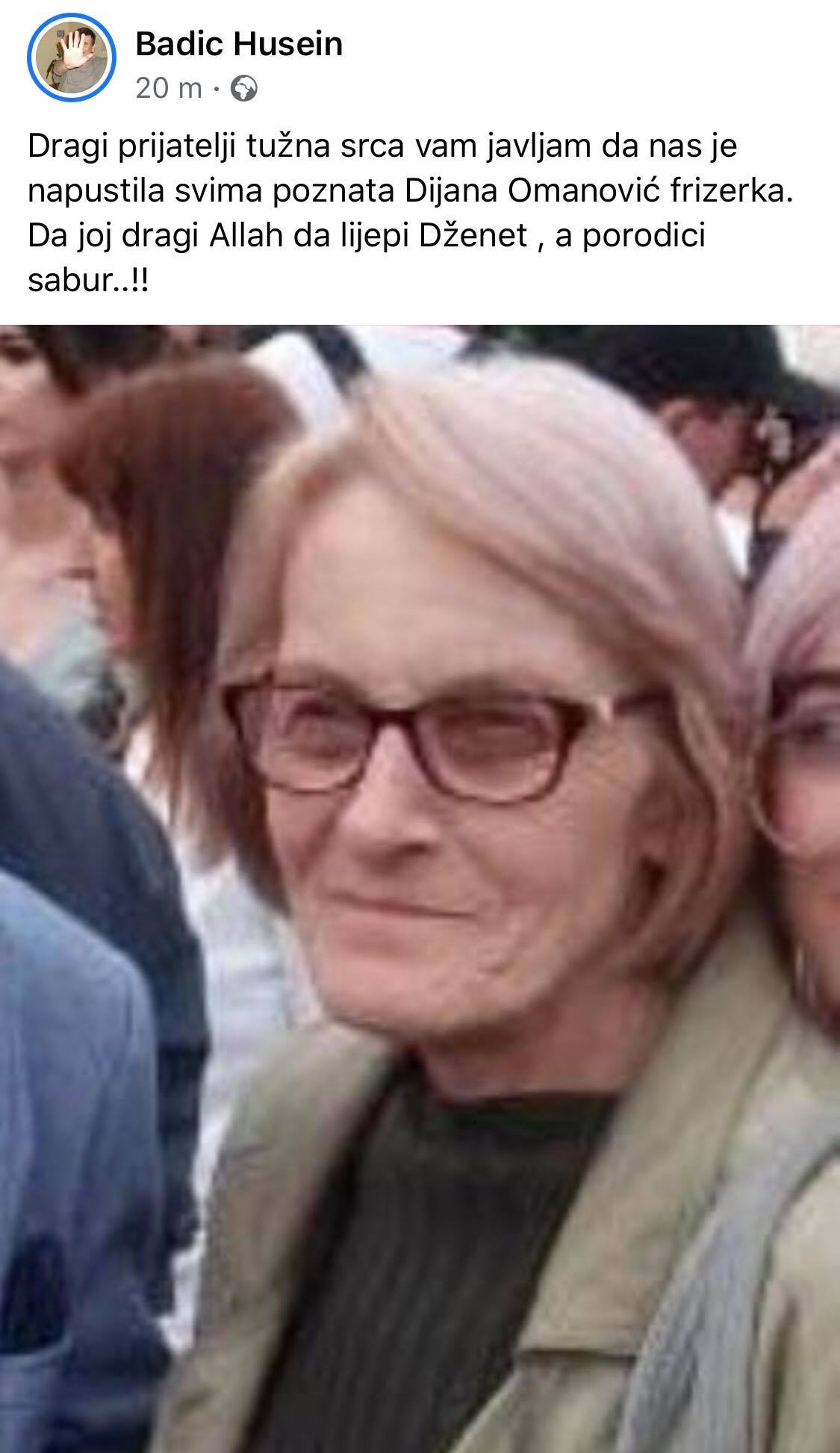 “Dragi prijatelji tužna srca vam javljam da nas je napustila svima poznata Dijana Omanović frizerka. Da joj dragi Allah da lijepi Dženet, a porodici sabur..!!”- objavio je na svome FB Husein Badić, cazinski aktivista i društveni radnik.