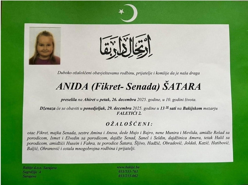 Duboko ožalošćeni obavještavamo rodbinu, prijatelje i komšije da je naša draga ANIDA (Fikret – Senada) ŠATARA preselila na Ahiret u petak, 26. decembra 2025. godine, u 10. godini života.