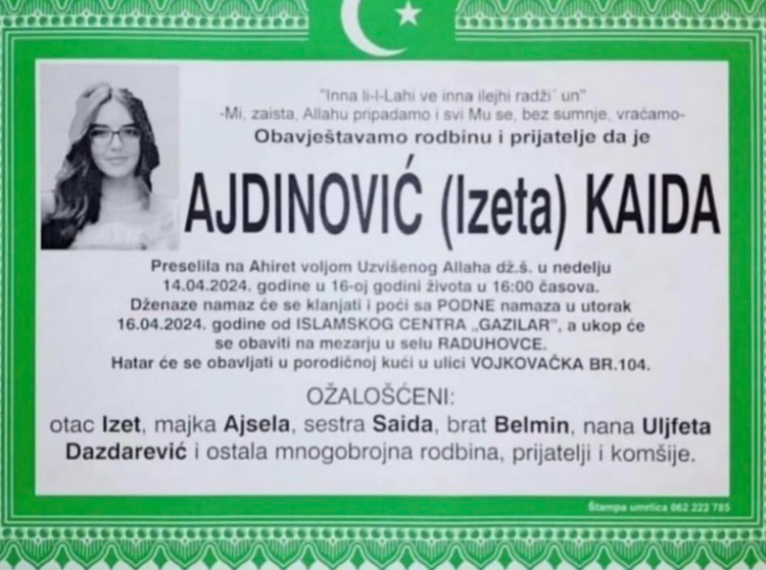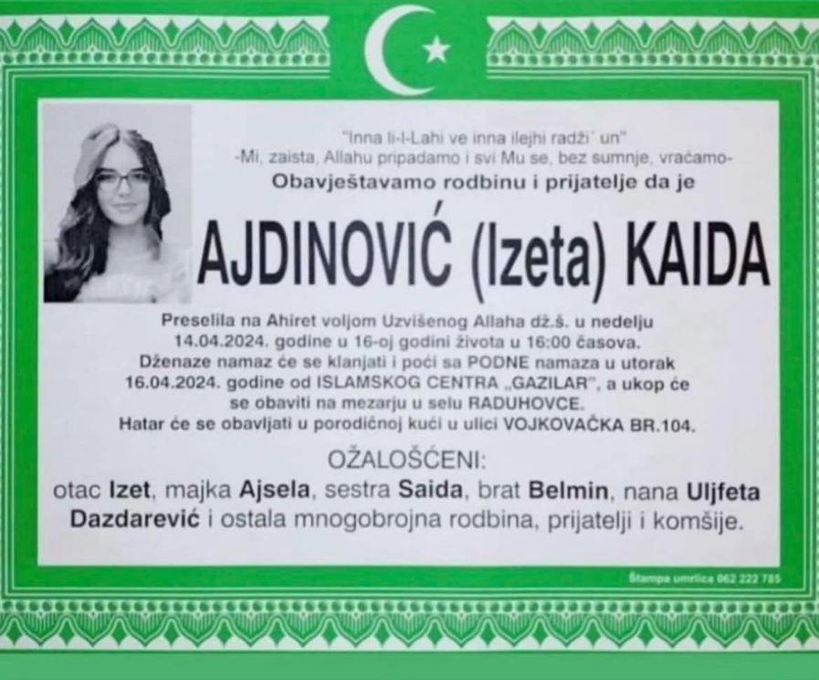 Obavještavamo rodbinu, prijatelje i poznanike da je 14.04. 2024 godine u 16. godini na Ahiret preselila Ajdinović (Izeta) Kaida.