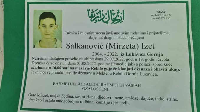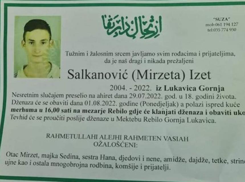 Tužnog srca i s bolom u duši obavještavamo rodbinu, komšije i prijatelje da je u petak, 29.7. 2022. godine,u 18.godini života, Allahovom dž. š. odredbom, na Ahiret tragično preselio naš dragi Salkanović (Mirzeta) Izet.
