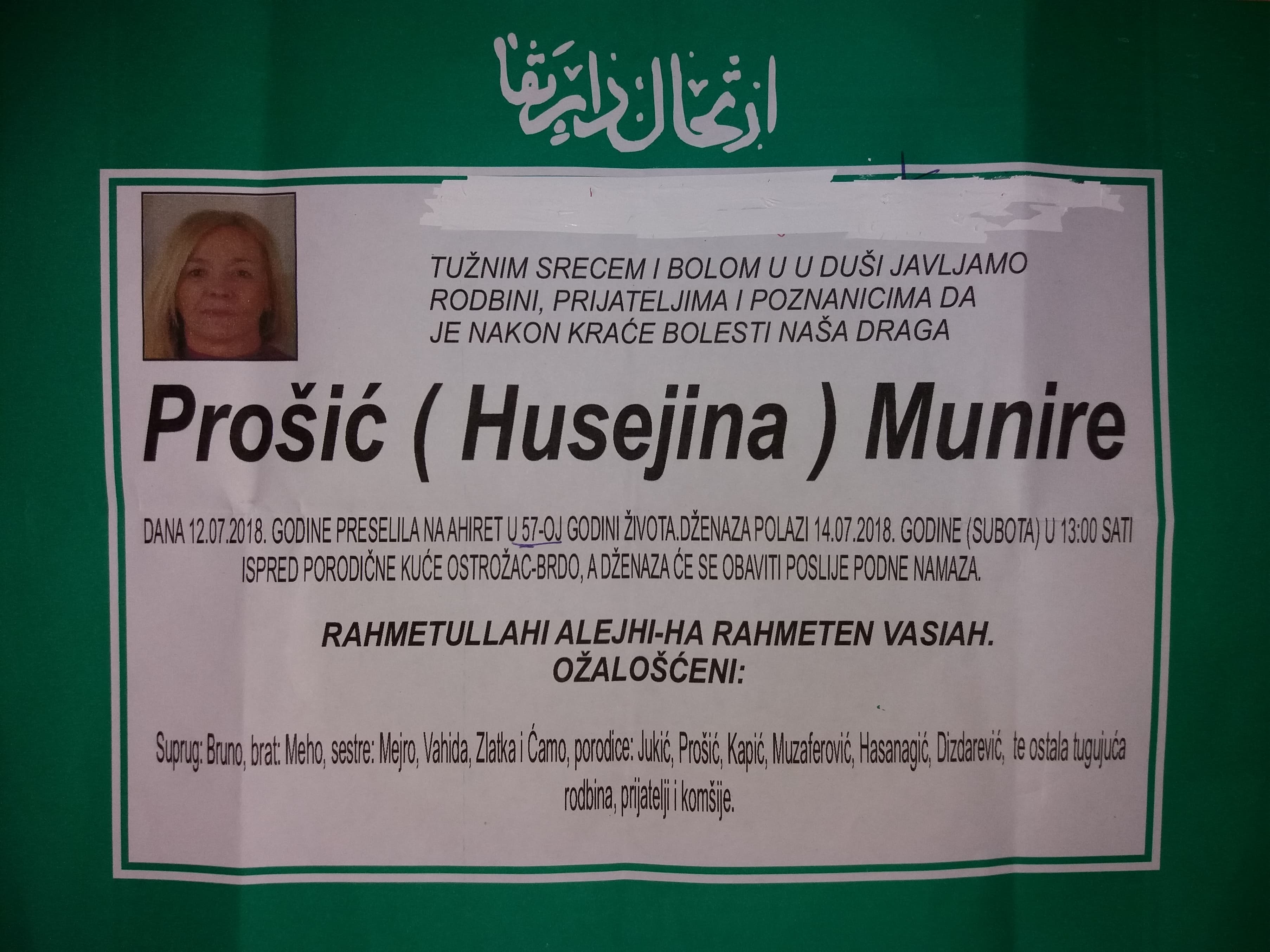 OBAVIJEST O SMRTI 13 Jul, 2018 - 10:57 / Uredio: urednik / 0 Comments U 57-oj godini na Ahiret preselila Prošić (Huseina) Munire Dana 12.07.2018. godine na Ahiret je preselila Prošić (Husein) Munire u 57-oj godini života. Dženaza polazi 14.07.2018. godine (subota) u 13:00 ispred porodične kuće Ostrožac - brdo, a dženaza će se obaviti poslije podne namaza. obavijest o smrti Dženaza ostrožac Related Articles OBAVIJEST O SMRTI 05 Dec, 2025 Na Ahiret preselila Smlatić (Mulalić) Vahida OBAVIJEST O SMRTI 05 Dec, 2025 Na Ahiret preselila hadži Sebila (Bajraktarević) Ćaušević OBAVIJEST O SMRTI 05 Dec, 2025 Na Ahiret preselila Prasko (Velid) Edina OBAVIJEST O SMRTI 05 Dec, 2025 Na Ahiret preselila Handanagić (rođ. Đurić) Esada–Enesa OBAVIJEST O SMRTI 05 Dec, 2025 Na Ahiret preselila Kapić (rođ. Abdić) Fatima OBAVIJEST O SMRTI 05 Dec, 2025 Na Ahiret preselila Nuhanović (Čazima) Sabina