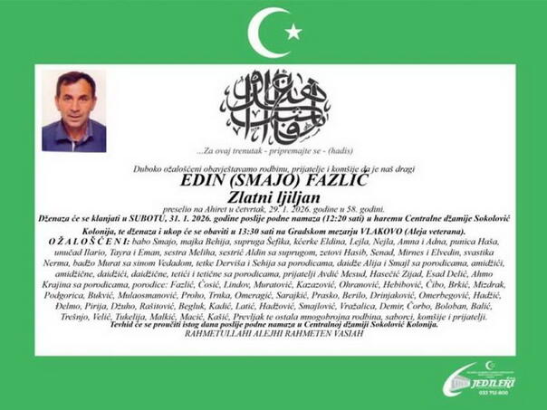Prethodno će biti klanjana dženaza u 12.20 sati poslije podne namaza u haremu centralne džamije u naselju Sokolović Kolonija. Edin (Smajo) Fazlić rođen je 7. jula 1968. godine u mjestu Brutusi, općina Trnovo. Učestvovao je u organizovanju pokreta otpora od septembra 1991. godine u "Zelenim beretkama".