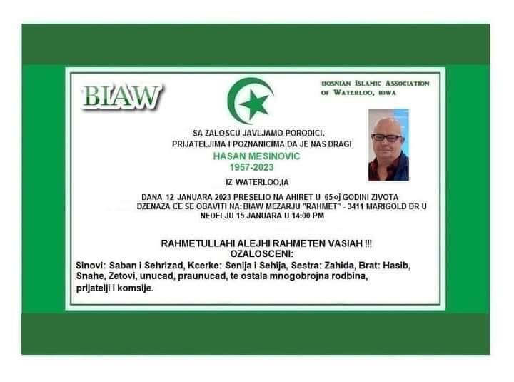 Dženaza namaz će se obaviti na: BIAW mezarju "Rahmet" . 3441 Marigold Dr u nedjelju 15.01.2023. godine u 14:00 PM.