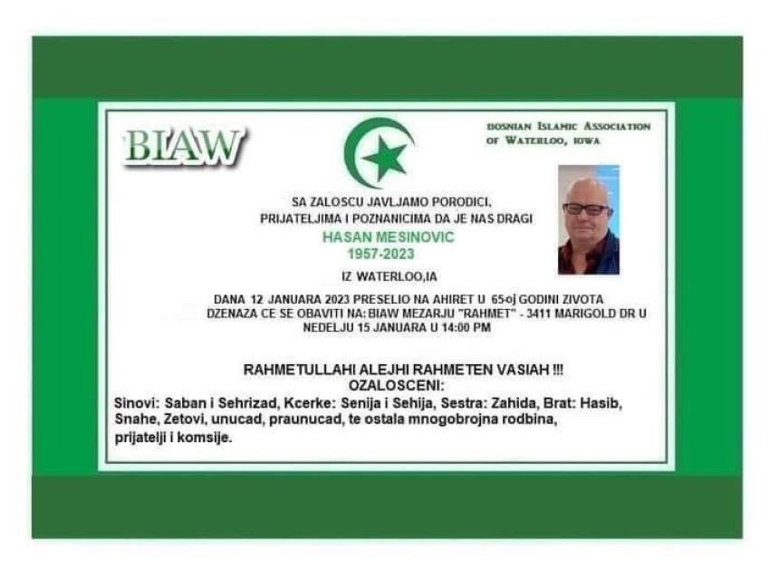 Tužnim srcem i bolom u duši javljamo porodici, prijateljima i poznanicima da je naš dragi Hasan Mešinović, dana 12.01.2023. godine u 65-oj godini života, preselio na Ahiret.
