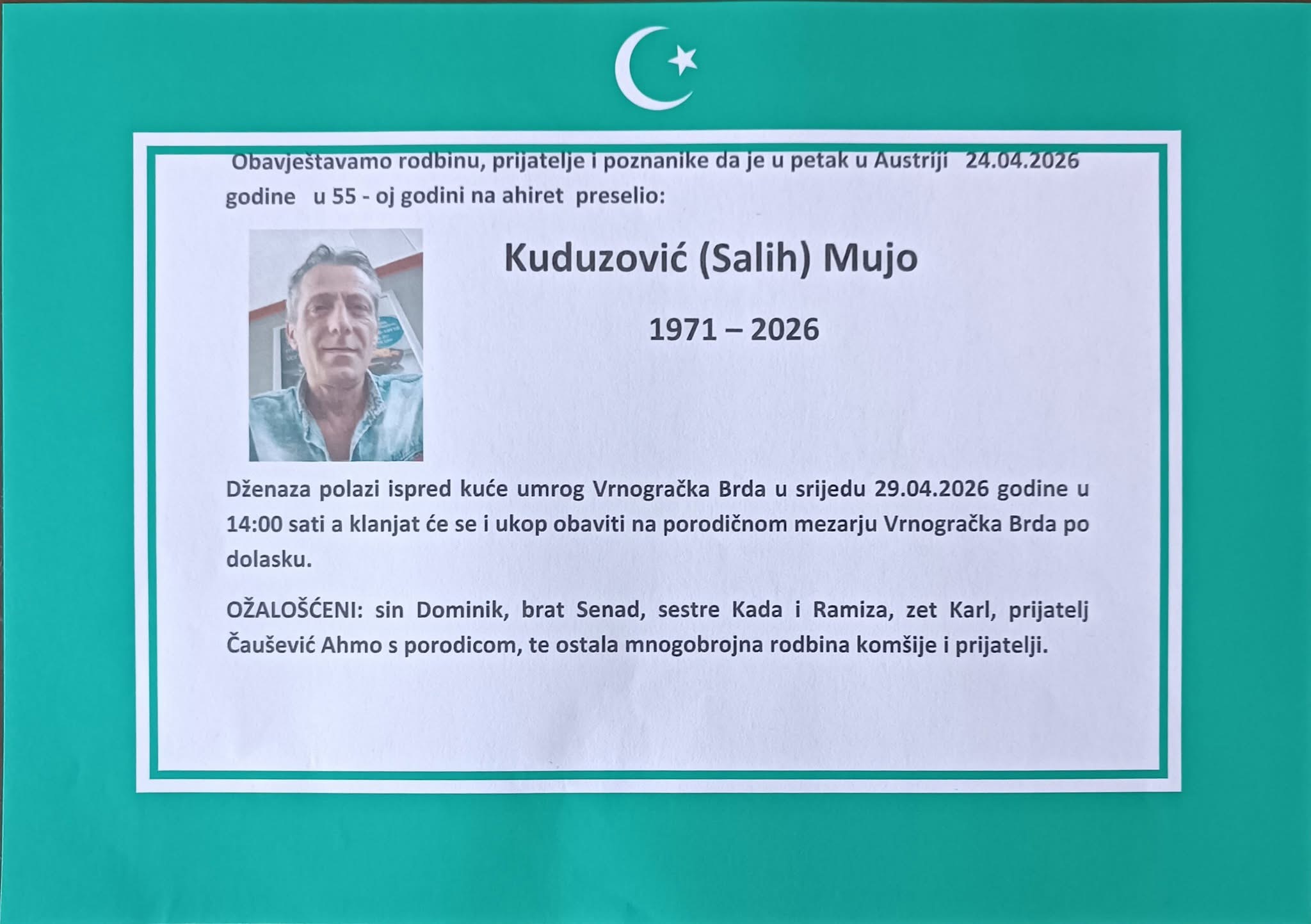 Obavještavamo rodbinu, prijatelje i poznanike da je u petak u Austriji 24.04.2026 godine u 55-oj godini na ahiret preselio: