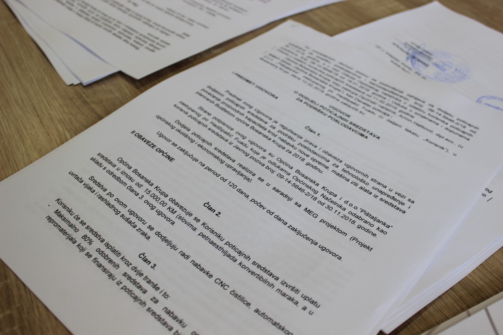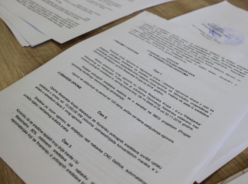 Poticajna sredstva, po 15 hiljada KM dobile su firme: Ibrahimović, Krupa kabine, Pištaljanka i Stolarija Suljić. Manje iznose i to 9.980 KM dobila je firma CNC N&K Tehnik Centar, te 2.229,50 KM firma Sigurna ruka. Sredstva u iznosu od 4.800 KM za pokretanje vlastitog biznisa, odnosno za samozapošljavanje dobio je Anes Kajtezović. Inače, sredstva za poticaje prvobitno su bila drugačije raspoređena, po 15 hiljada KM za 4 firme i po 5 hiljada za 4 fizička lica, ali su pojedini kandidati odustali od svog zahtjeva što je rezultiralo izmjenom odluke o odabiru korisnika.