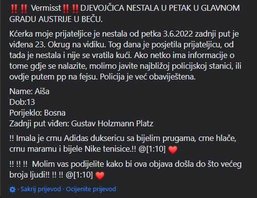 Trinaestogodišnja djevojčica iz BiH nestala je u Beču od petka 03.06.2022. godine.