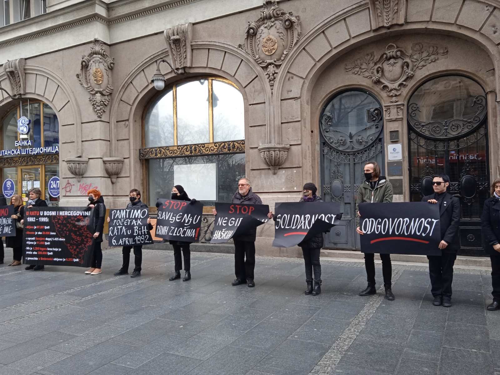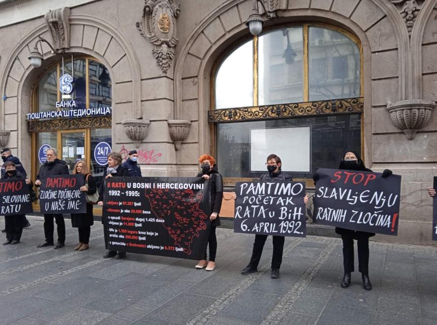 - Rat u BiH bio je najkrvaviji oružani sukob na tlu Evrope nakon Drugog svetskog rata, koji je iza sebe ostavio blizu 100.000 ubijenih ljudi, 2 miliona raseljenih lica, više od 20.000 žena koje su preživele ratno silovanje. Opsada Sarajeva trajala je 1475 dana i bila je najduža opsada jednog grada u modernoj istoriji. Tokom opsade ubijeno je preko 11.000 odraslih osoba i više od 1.600 djece. Na grad je ispaljeno više od 480.000 projektila… Režim Slobodana Miloševića davao je političku, logističku, vojnu i svaku drugu podršku bosanskim Srbima, iako zvanično ‘Srbija nije bila u ratu’. Bombe koje su bačene na Sarajevo proizvedene su u Srbiji, ljudi iz Srbije masovno su učestvovali kao dobrovoljci… Mnogi predstavnici današnje vlasti u Srbiji, uključujući i Aleksandra Vučića, aktivno su učestvovali u toj politici, kazale su Žene u crnom.