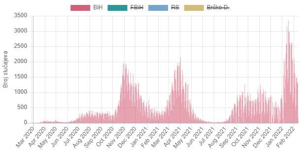 Poređenja radi, u Bosni i Hercegovini je jučer, 12. februara, registrovano 1.289 osoba pozitivnih na koronavirus, od 3.451 obrađenog testa. Preminulo je 46 osoba.